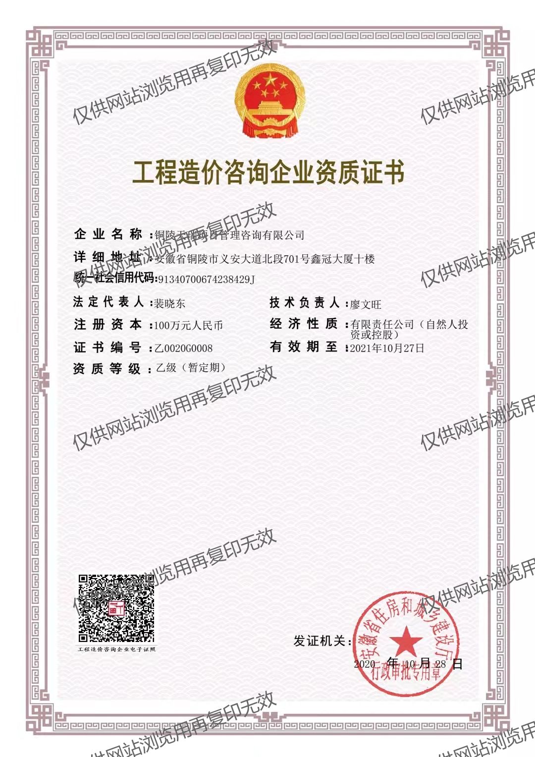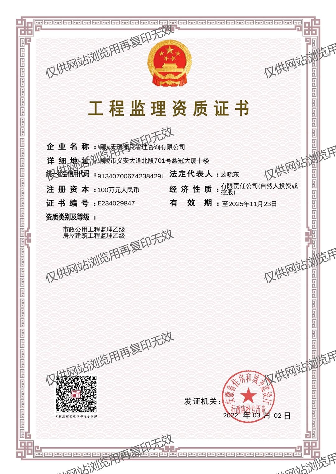 銅陵天瑞項(xiàng)目管理公司具有:工程監(jiān)理乙級(jí)資質(zhì)、工程造價(jià)乙級(jí)資質(zhì)、招標(biāo)代理及政府采購(gòu)資質(zhì)(備案)、工程咨詢(xún)資質(zhì)(備案)等資質(zhì)。